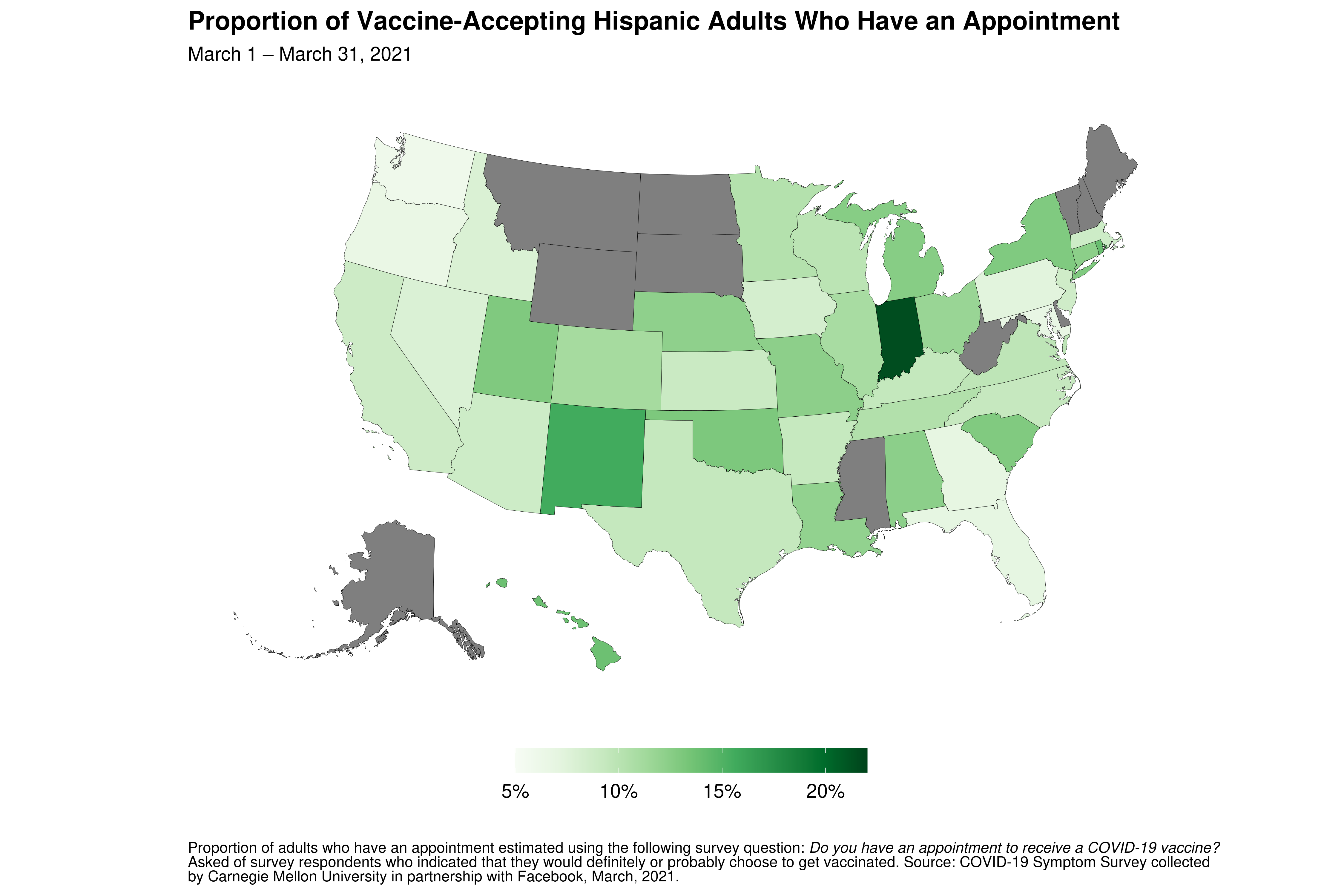 Nationally, the proportion of unvaccinated vaccine-accepting Hispanic adults who currently have an appointment to get a vaccination (9.4%) is much lower than for White adults (15.7%). There is, however, significant disparity by state: